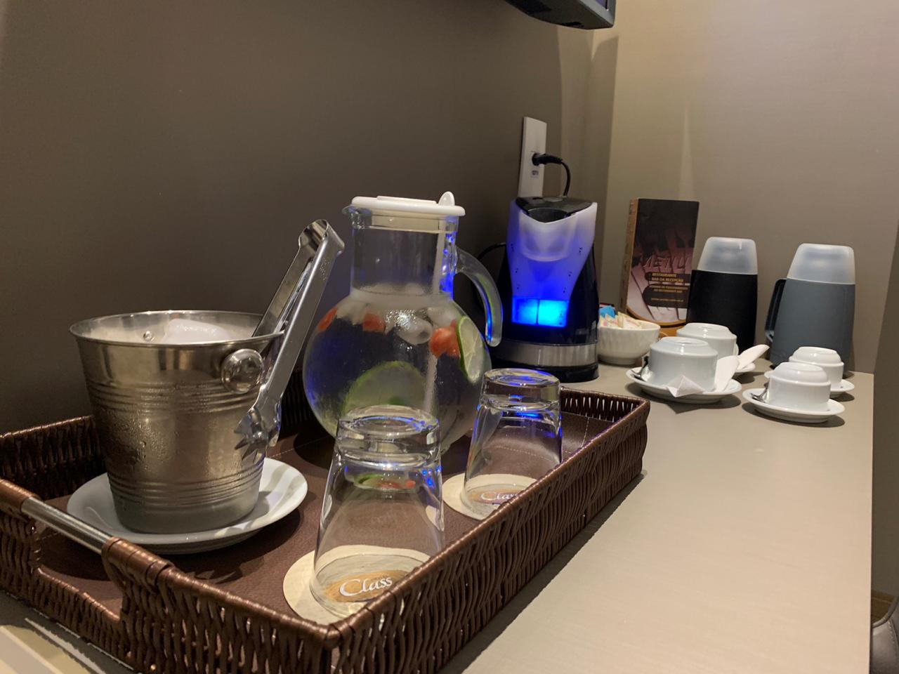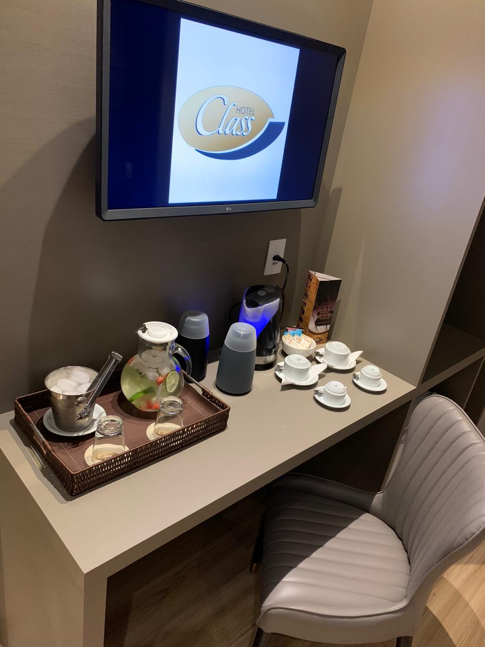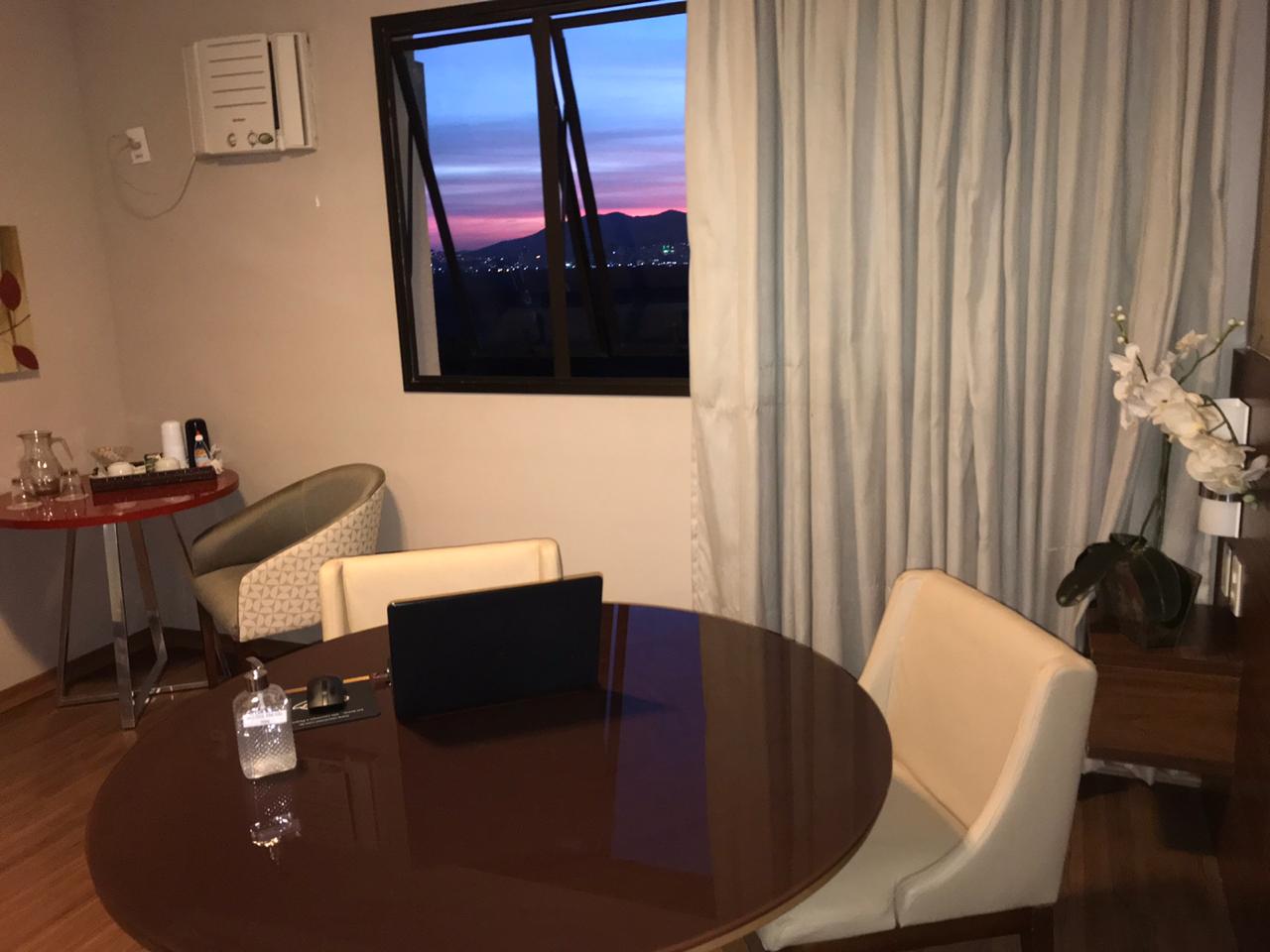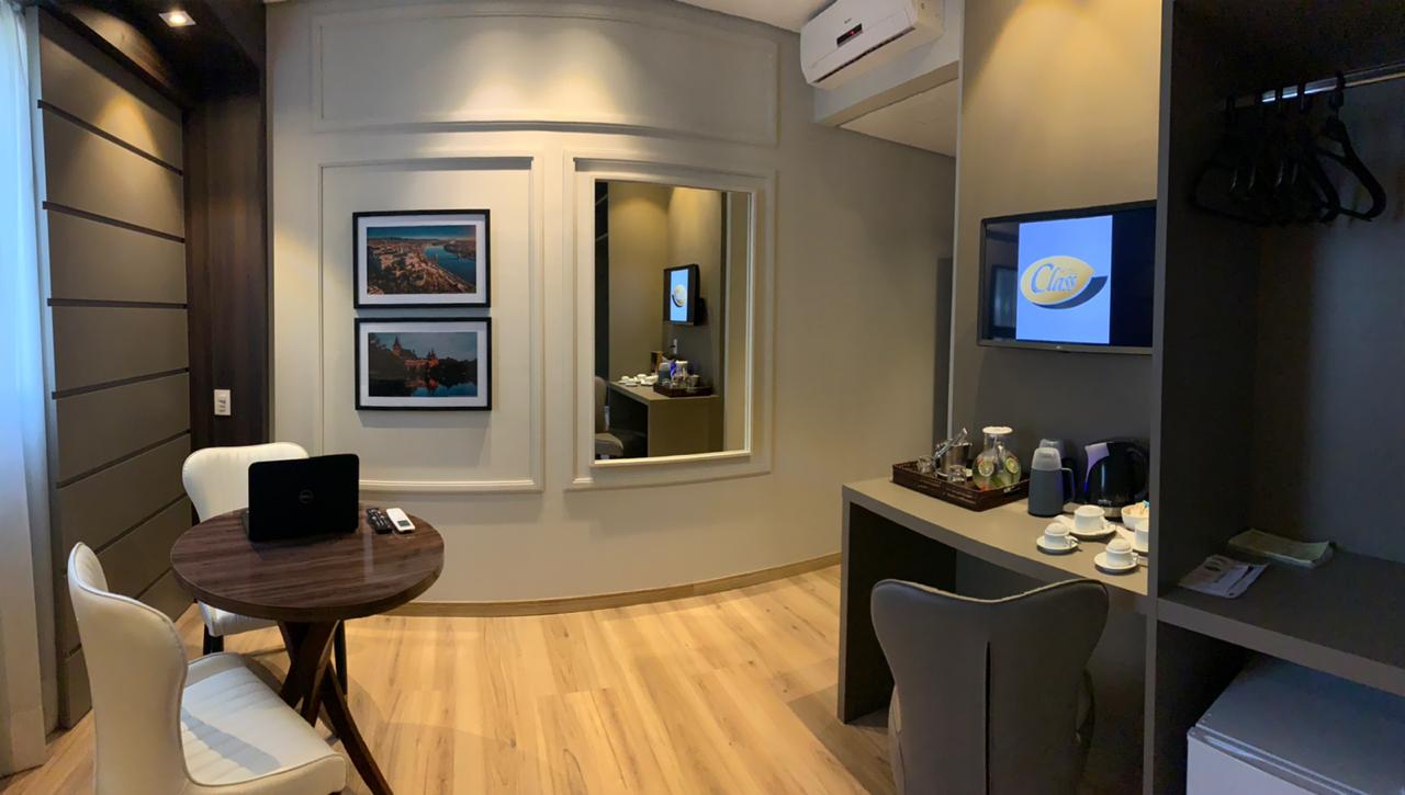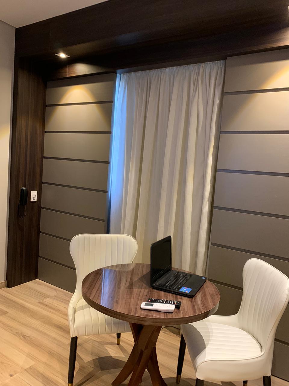 - • Structure: 01 round table, 3 chairs of the same model, coffee and other items are on the bench next to the TV, a flower arrangement and a vase with flavored water.